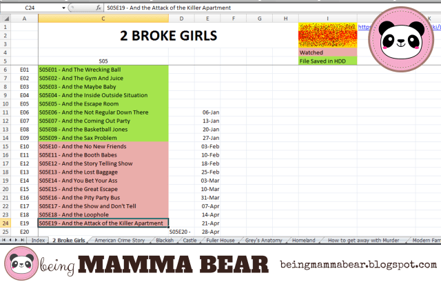 I have a colour-coded excel file with a separate sheet dedicated to each show I’m currently watching to keep track of how far along a certain show’s season I am, along with the future air-dates of shows that are currently running, just so I know when there’s a new episode.